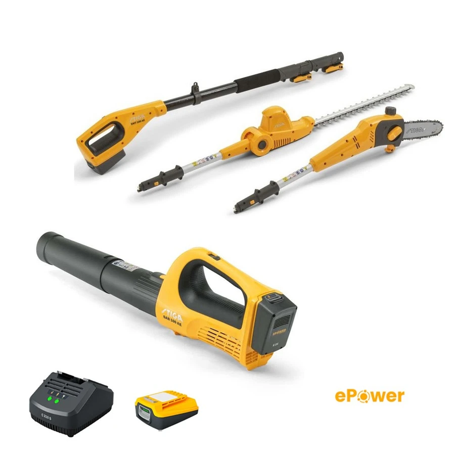 מהירות זרימת אויר מירבית 9 מ"ק/דקה. כלי זה שקט במיוחד, ידידותי לסביבה וקל לתחזוקה. הכלי מאוזן וללא רטט, וקומבי גובה רב תכליתי נטען סטיגהMT 100eמונע על ידי סוללה ומנוע 20 וולט. כלי זה קל משקל ועוצמתי במיוחד. הקומבי כולל מוט הארכה טלסקופי מתכוונן, אביזר גיזום ואביזר ניסור